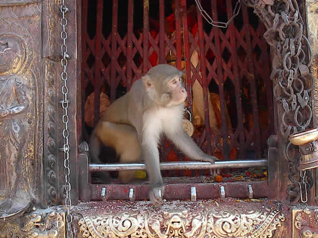 Aufmerksamkeit der Affen und werden flugs aus den Armen des Gottes stibitzt.