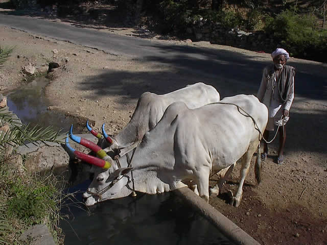 umzäunt. Das Wasser aus den tiefen Brunnen wird mit Hilfe von Ochsengespannen