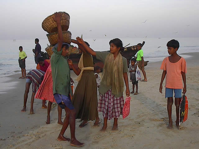 Frühmorgens am Strand, die Sonne ist soeben aufgegangen. Einheimische