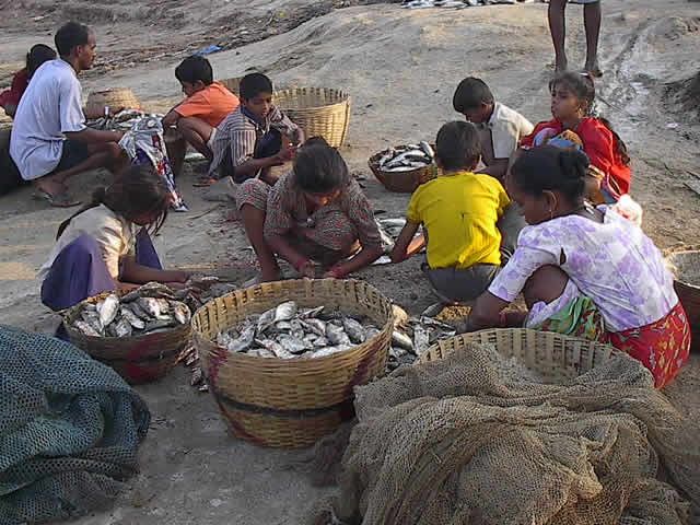 Mit kleinen Booten wird der Fang ans Ufer gebracht wo Leute die Körbe