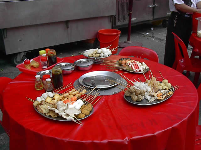 Satay Celup. In einem Topf, welcher mitten im runden Tisch eingelassen