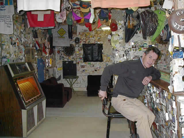 an Wänden und Decke ist zugepflastert mit Visitenkarten, Fähnchen,