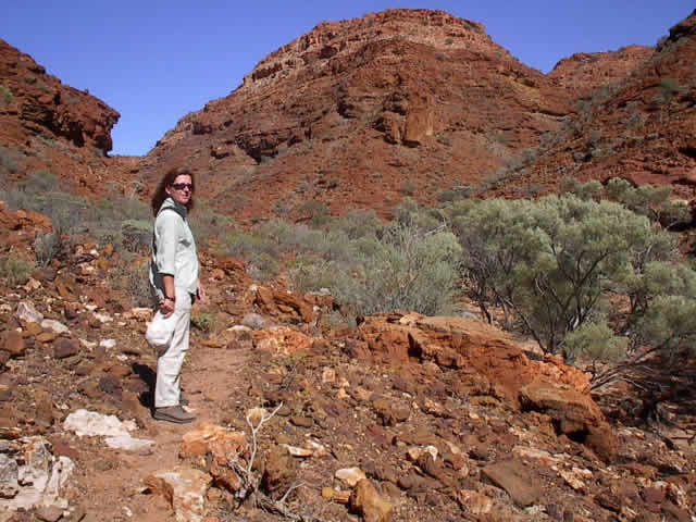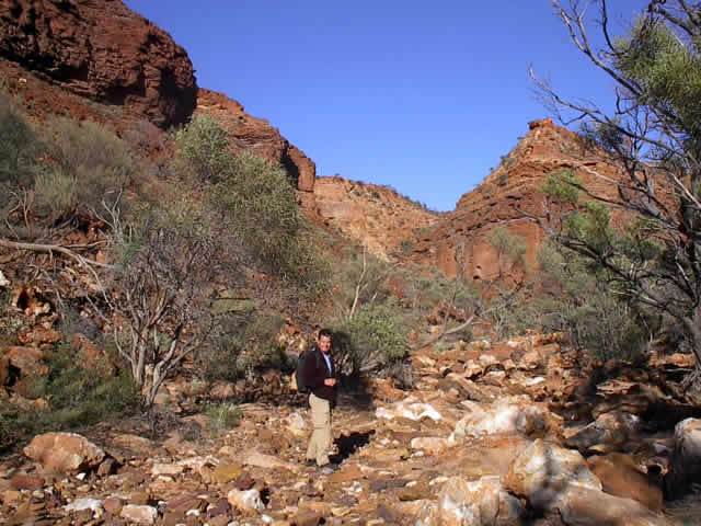 Buschcamp, am Fusse schroffer, roter Felsen auf.