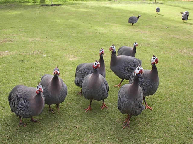 und auf die vielen bunten Papageien, die auf der Wiese vor der Veranda